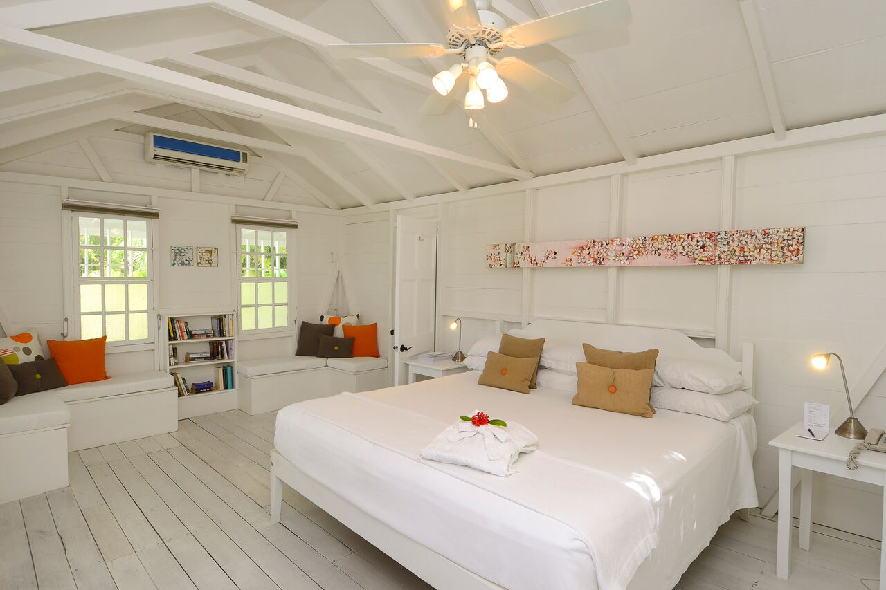 A 100-year old plantation house set apart from the main hotel in its own 2 acres of gardens with magical vistas across to Nevis Peak and distant Ocean views. This 2 Bedroom House is perfect accommodation for a family. The Master Bedroom with 1 King Bed connects to a bedroom with 2 Twin Double Beds – one large bathroom with walk in rain shower. Across the large wrap around veranda one enters the living / dining room with a full kitchen (can be stocked by the hotel on request) and a second full bathroom with a walk in shower. The living room is equipped with a sofa bed making it an optional sleeping area for additional guests. Screened louvered windows throughout maximize the cool mountain breeze or individual ceiling fans or air conditioning can control air temperature. Open the doors to the living room and take in the views of the Caribbean Sea and Nevis Peak. In the evening sit back and watch a movie on the flat screen TV or listen to music on the veranda.